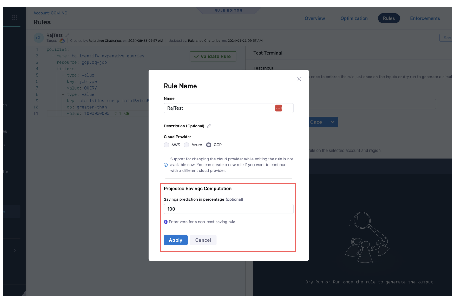 - Revamp Perspective Rule Builder UX: We’ve revamped the UX for the Perspective Rule builder. The time range selection in Perspective creation is now on the right side near the chart, and the Rule Name and Folder fields are moved into a separate modal. This updated rule builder is also used in Cost Categories. [CCM-24935]