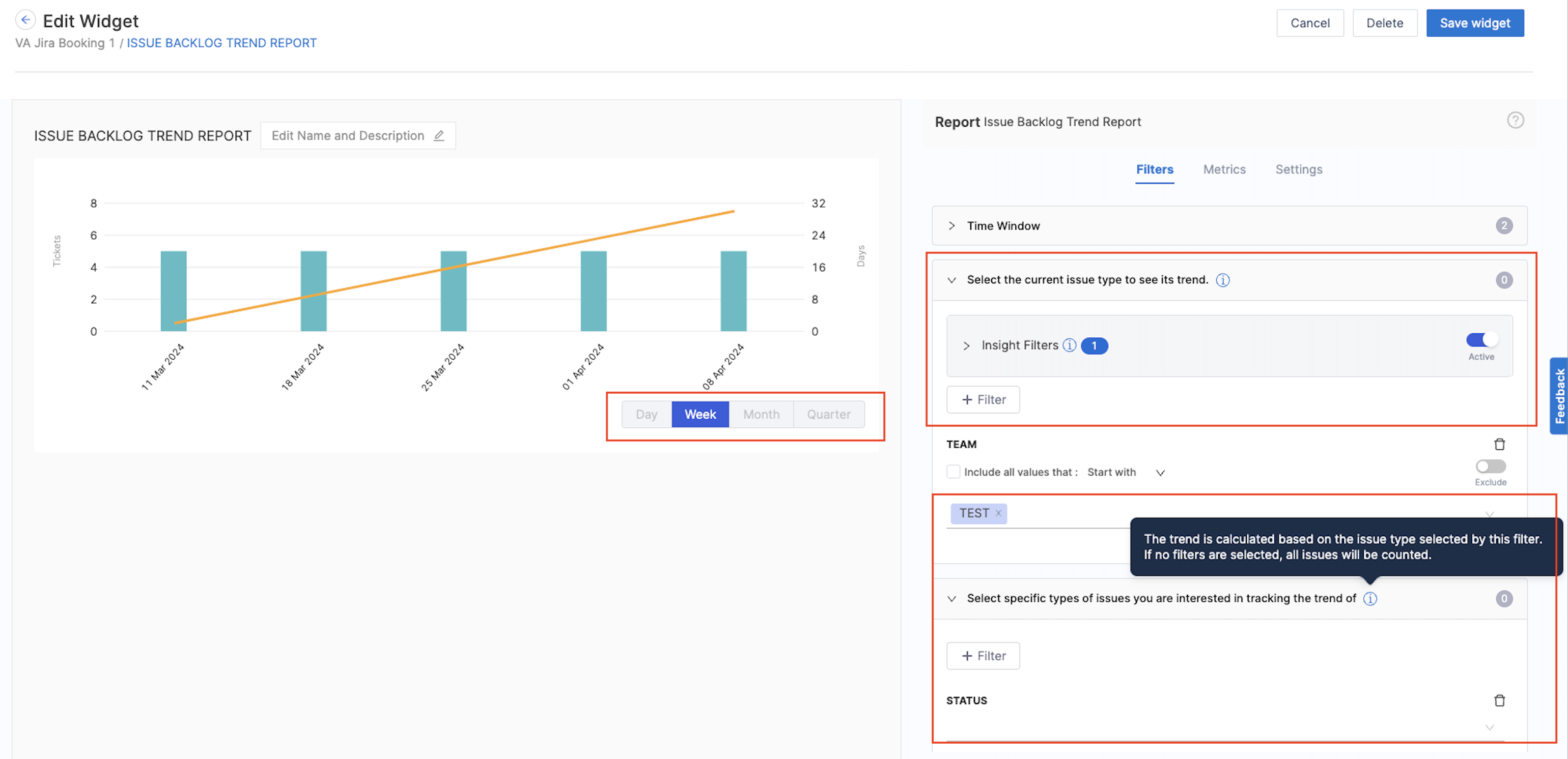 • Fixed a bug in the Jira Backlog Trend Report where the first month's bar was missing from the bar chart when selecting time ranges like Last Month, Last 3 Months, Last Quarter, or Last 2 Quarters. (SEI-10818)